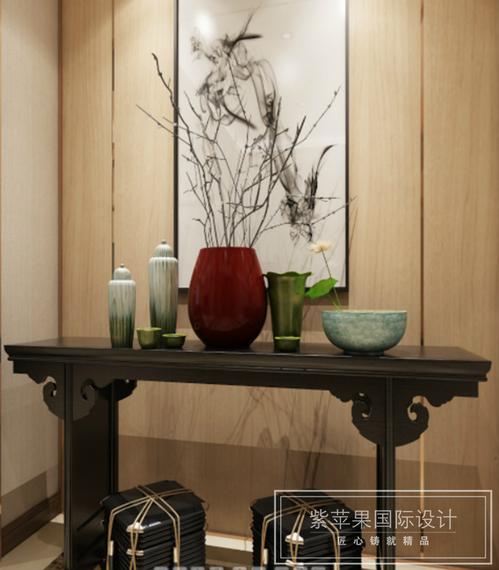 主人对于风水颇有讲究,自身五行属土,所以我们在设计时家居整体色彩上以大地色系为主。梨花木色的门配以局部的原木色的墙饰将低调、儒雅慢慢呈现。加上富有细节的条案、餐椅将新中式的文化气息得到升华。整体有如一幅山水画,值得人慢慢品味,经久不衰。又如一碗茶,一口清淡,再品醇厚,齿颊留香。