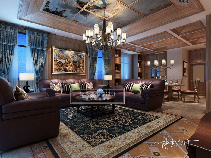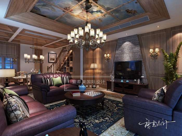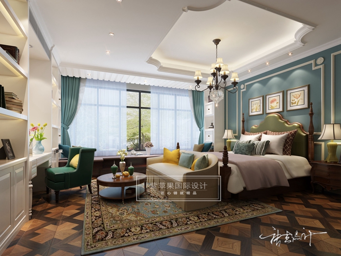 如果说古典美式风格线条复杂、色彩低沉,本案设计风格则在古典欧式风格的基础上,以简约的线条代替复杂的花纹,采用更为明快清新的颜色,既保留了古典欧式的典雅与豪华,又更适应现代生活的悠闲与舒适。
