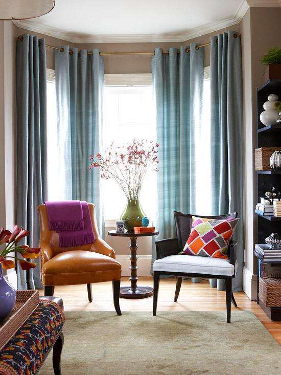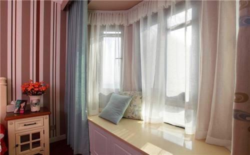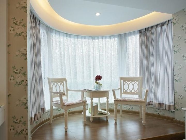 都知道现在窗帘都是两层,纱帘和布帘,那么对于这种窗户,除了按照以上多边形窗户和圆弧形窗户的几种方法,还有一种就是沿着飘窗做纱帘,而将布帘放在飘窗里部,这样会很方便,采光也会比较好▼