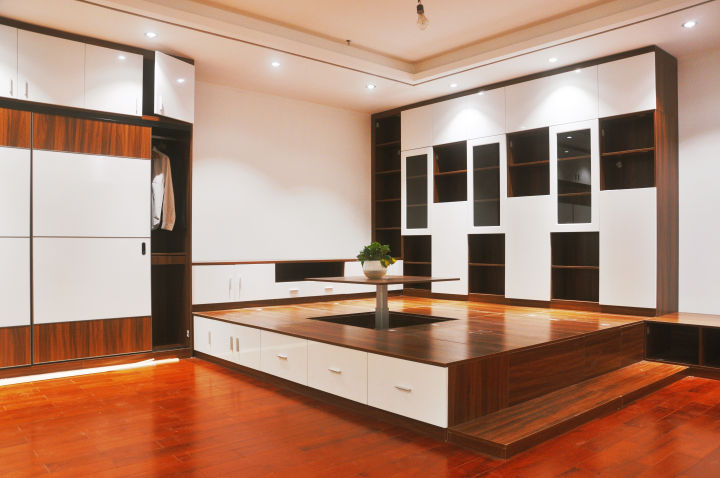 (1)次卧可以做榻榻米,现在的榻榻米基本都是定制,可以卡墙做,不浪费空间,榻榻米高度一般在400mm-450mm,内部箱体可以用来存放过季的被子,衣物等。且榻榻米上面还可以做衣柜书柜等,空间利用率非常高。