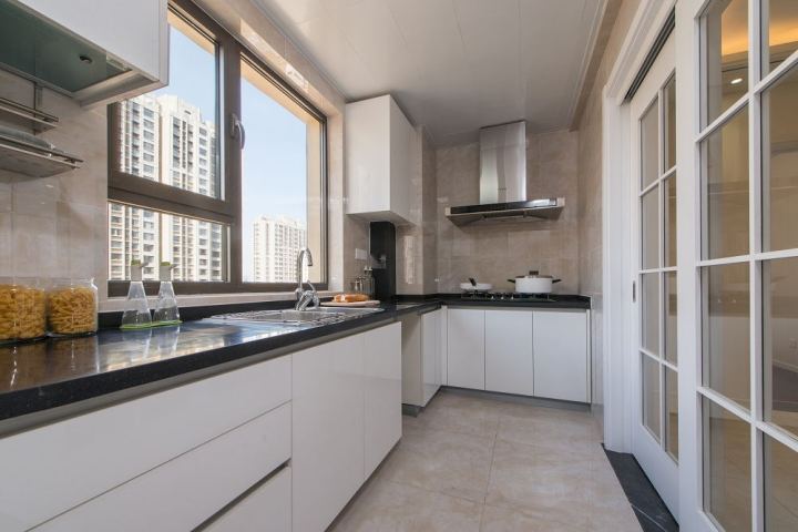 开放式厨房固然美观,但油烟、收纳及整洁性等问题是不得不面对的,不妨考虑安装玻璃推拉门,透过玻璃看到家人和自己在一起,做饭也就没那么无聊了,推拉门相对于平开门而言还可以减少开关门占用的空间。