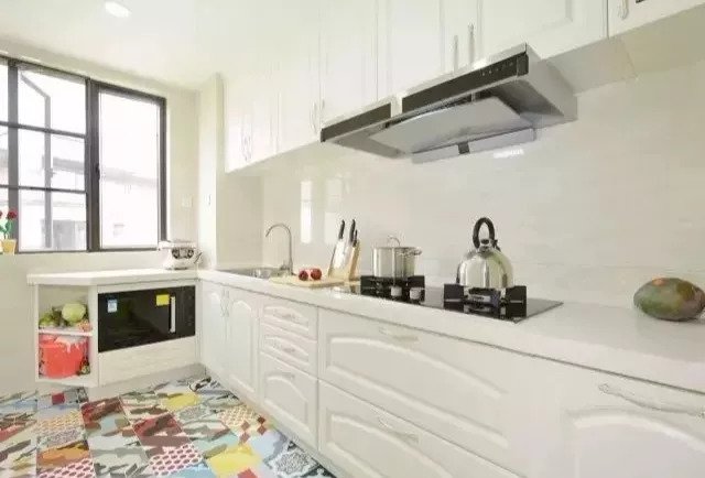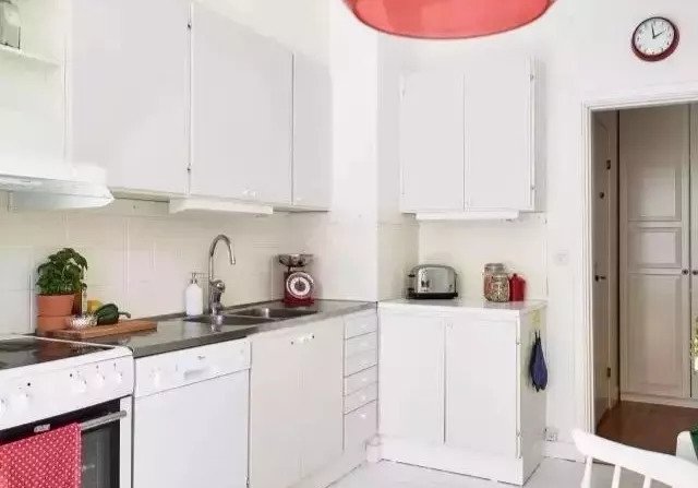 如果觉得橱柜颜色有些单调,这个时候可以用局部亮点来点缀:餐具、台面、电器、花卉都是搭配利器。你想得到的都可以用得上。