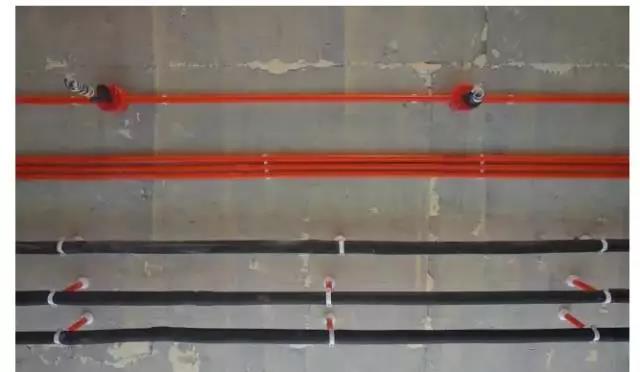 强、弱电线路平行布置,间距不得小于300mm。强弱电交叉布置时,须进行弱电屏蔽处理(弱电线管先包裹锡铂,外面再紧密缠绕红色防水电工胶布,两端超过强电线管外侧150mm)。