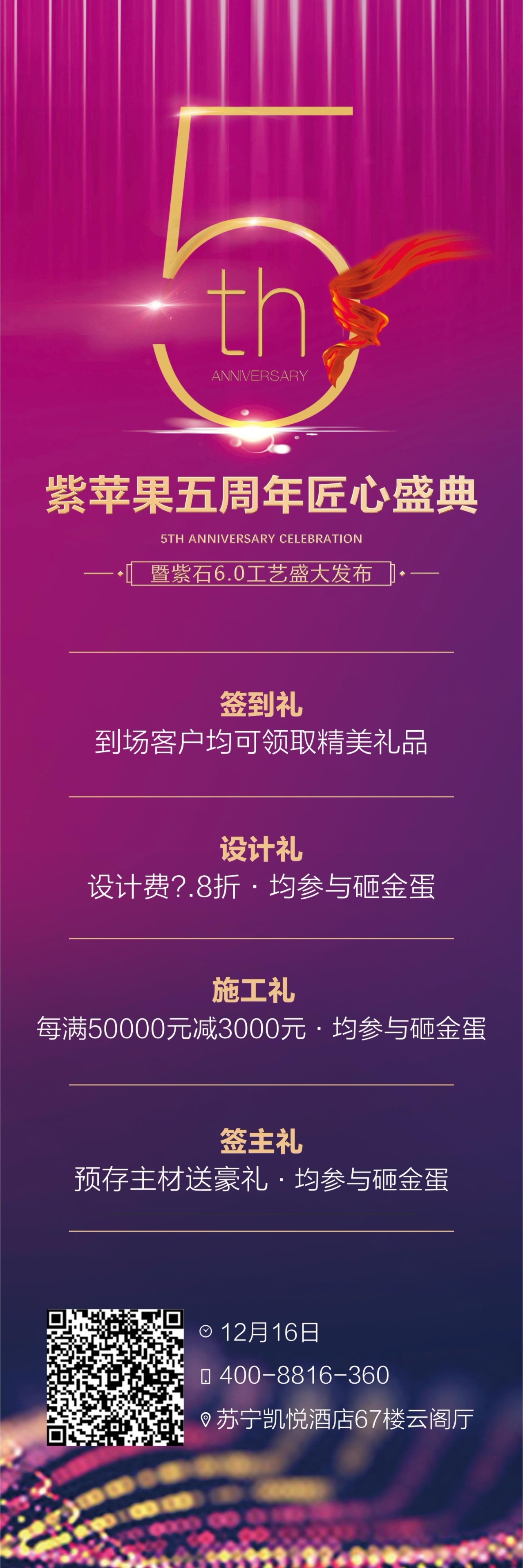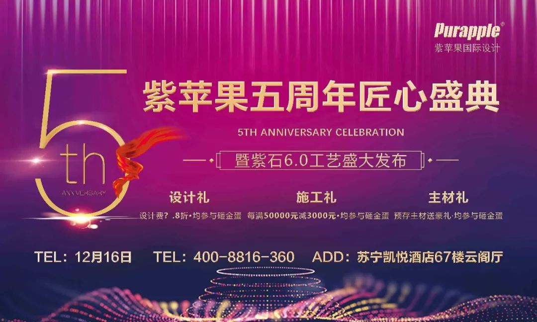紫苹果即将迎来无锡公司5周年庆典,感谢您一直以来对我们的鼎力支持,为表达我们对您的感激之情,特借此次周年庆,邀您光临“苏宁凯悦酒店67楼”,分享我们的快乐!