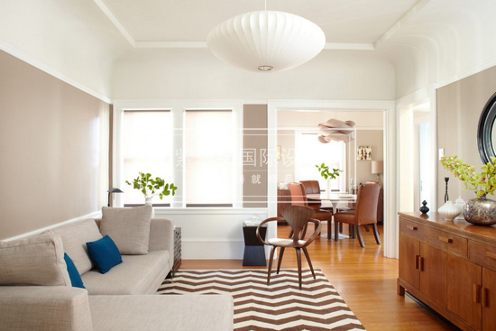 色彩会直接影响到人的视觉效果,暖色调为扩张色(热胀),冷色调为收缩色(冷缩)。而深色的地板比较有伸缩视觉效果的,常用于大空间房屋,选择深色地板时家具最好不要选择同色系,这样会给人的感觉是一体的,没有层次感。所以选择家具为白色或者原木色家具最为合适,对比效果也会很强,这样搭配起来空间会更有条理性。