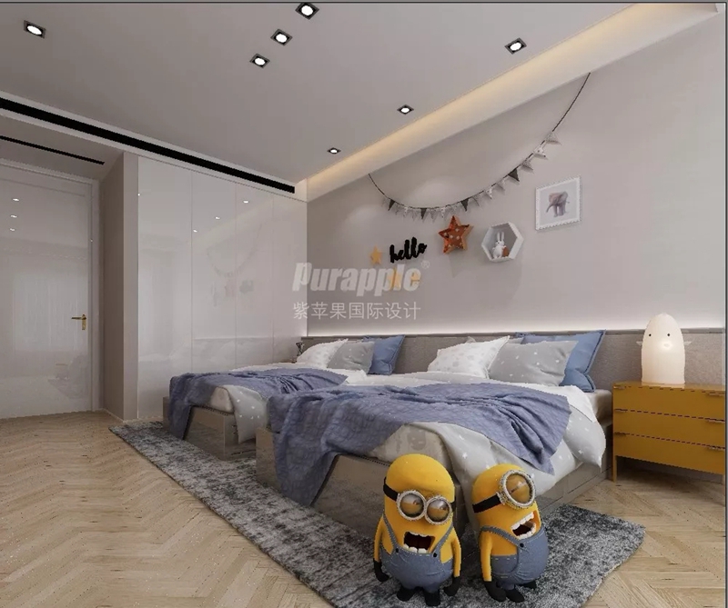 儿童卧室,选择了与主卧相似的极简白色吊顶,灰色的床头柜造型,也是质感十足,极简童趣的床头挂饰和可爱的床头灯瞬间提升空间的灵动性。