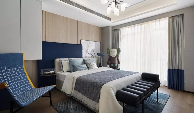 二层主卧空间营造了品质宁静的生活状态。沉稳的色调,设计在细节塑造中呈现生活的品质感,带来岁月静好的自然气息。