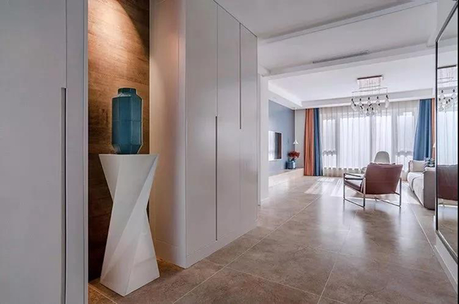 玄关进门后做了一个壁龛造型,摆上一只蓝色的花瓶并在顶上装一盏射灯,整个空间都显得格外的温馨精致。再往里则是通顶的收纳柜,白色的柜体也让空间显得更加的简约现代。