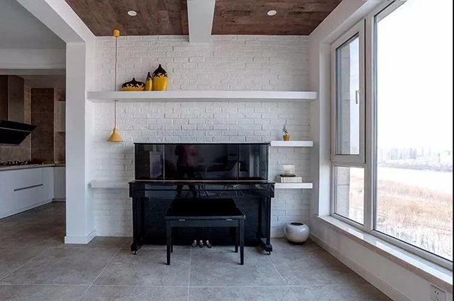 在安静之余,休闲区的另一端以白色文化砖+搁板为基础,摆上一张黑色的钢琴,静中有声,宛如坐在柳湖旁的一位优雅女子,儒雅高尚。