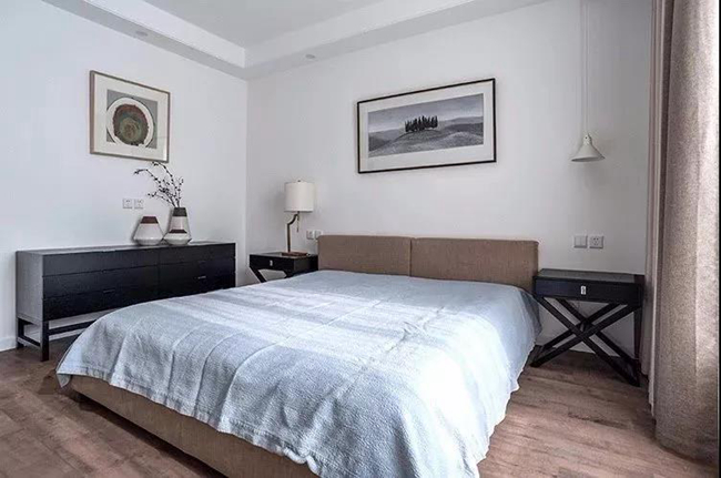 卧室空间同样在简约为主,木地板+简洁的墙面,还有一张灰色的床单,搭配上黑色的床头柜与斗柜,还有禅意极简的软装点缀,细节处散着一丝舒适惬意的气息。