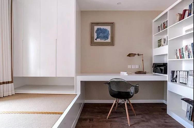 次卧以榻榻米+书桌+收纳的组合设计,紧凑的空间装出实用的功能,可以作为客房也可以做书房,空间利用巧妙精致。