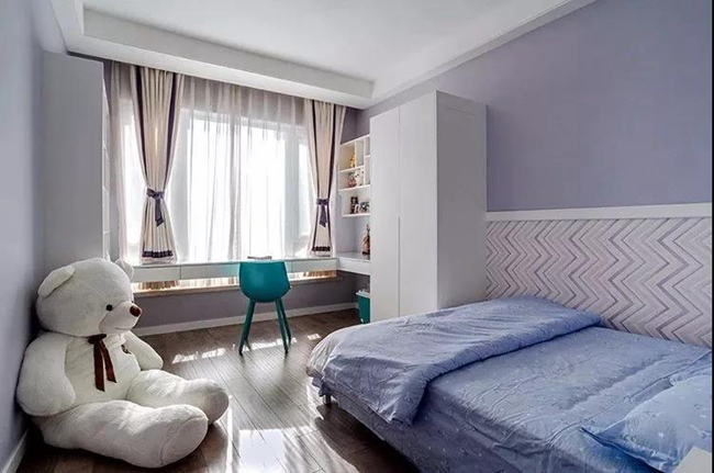 儿童房在淡淡的蓝紫色为基础下,墙脚部分是波浪纹的护墙板,配上一套淡蓝色的床单,还有一只大公仔,充满了轻松惬意的气息。