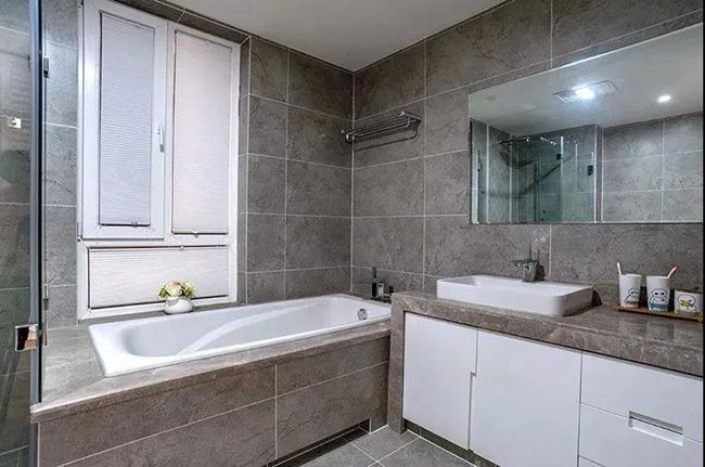 卫生间装了个浴缸,整体大理石与瓷砖封装的空间,简约时尚而又实用高档。