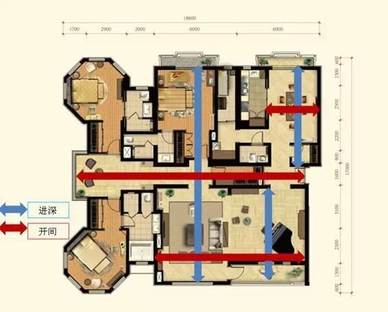 开间、进深:习惯上,我们把房间的主采光面称为开间(面宽),与其垂直的称为进深。也可根据房间门的朝向来确定开间和进深,房门进入的方向的距离为进深,左右两边距离为开间。