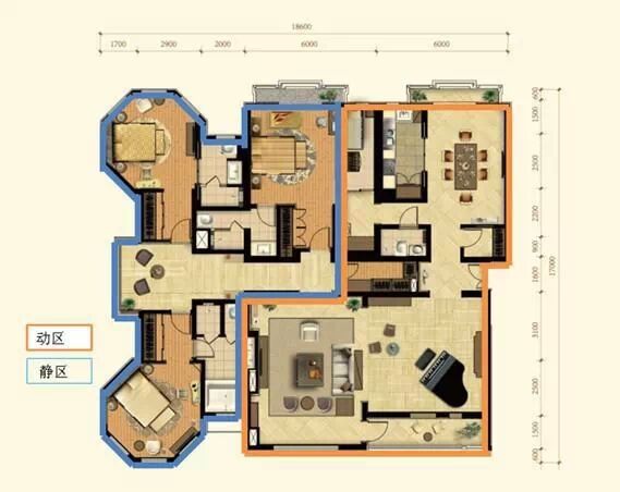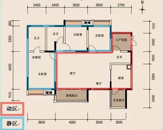 动静分区:动区是人们活动较为频繁的区域,应该靠近入户门设置,尤其是厨房;包括客厅、餐厅、厨房、卫生间为动:而静区主要供居住者休息,相对比较安静,应当尽量布置在户型内侧,包括卧室、书房为静。两者分离,一方面使会客、娱乐或者进行家务的人能够放心活动,另一方面也不会过多打扰休息、学习的人,减少相互之间的干扰。范例如下: