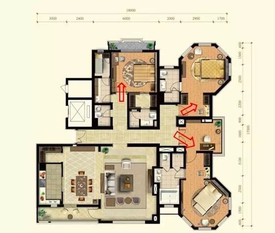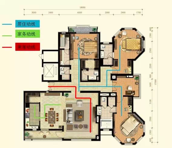 好的动线能够提升户型利用率,而差的动线会使大户型变得“大而无当”,浪费空间。户内主要动线有三类,分别是居住动线、家务动线、来客动线。