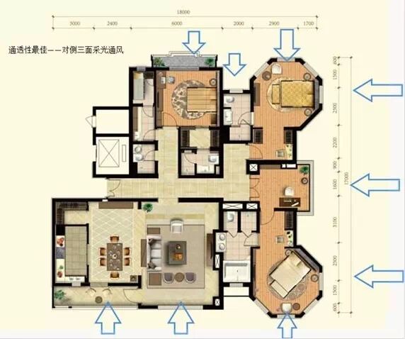 通透性主要是指户型的通风和采光性能。要保证户型具有良好的通透性能,首先要求户型要有良好的进深开间比,即户型比较方正;其次户型最好有两面可以采光和通风,相对两面采光通风最佳(如南北、东西)。