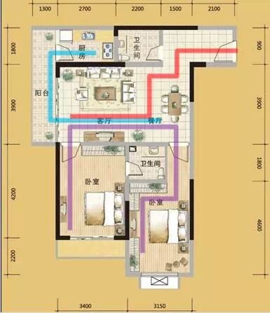 动线良好(从入户门进客厅、卧室、厨房的三条条线不会交叉)范例如下: