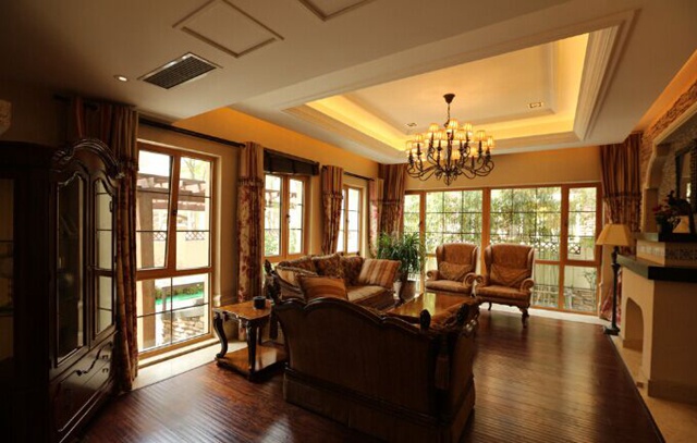 6.客厅布置原则之采光,一般来说别墅装修的客厅都有良好的采光度,但是到了晚上就需要保证室内的关系问题了,无锡紫苹果别墅装修公司建议选择白、黄两色搭配最好。