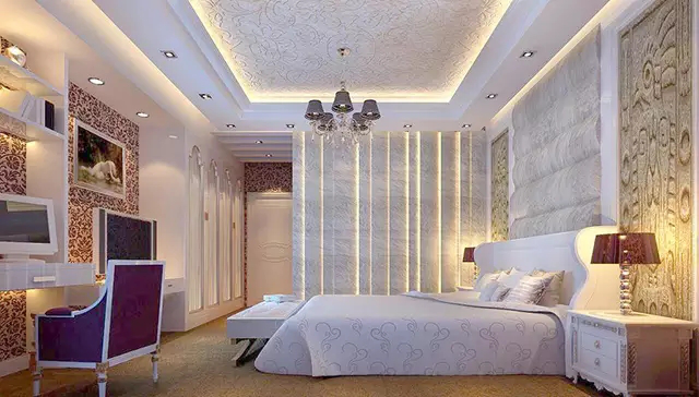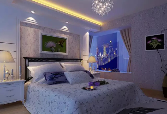 尽量不要使用装饰性太强的悬顶式吊灯,它不但会使你的房间产生许多阴暗的角落,也会在头顶形成太多的光线,躺在床上向上看时灯光还会刺眼。最好采用向上打光的灯,既可以是房顶显得高远,又可以使光线柔和,不直射眼睛。除主要灯源外,还应设台灯或壁灯,以备起夜或睡前看书用。另外,角落里设计几盏射灯,以便用不同颜色的灯炮来调节房间的色调,如黄色的灯光就会给卧室增添不少浪漫的情调。