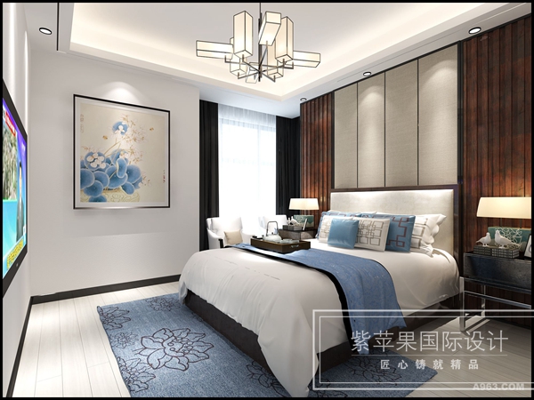 卧室的功能主要是睡眠休息,属私人空间,不向客人开放,所以卧室装修不必有过多的造型,通常也不需吊顶,墙壁的处理越简洁越好,通常刷乳胶漆即可,床头上的墙壁可适当做点造型和点缀。卧室的壁饰不宜过多,还应与墙壁材料和家具搭配得当。卧室的风格与情调主要不是由墙、地、顶等硬装修来决定的,而是由窗帘、床罩、衣橱等软装饰决定的,它们面积很大,它们的图案、色彩往往主宰了卧室的格调,成为卧室的主旋律。下面我们来欣赏下【无锡紫苹果装饰】卧室装修效果图