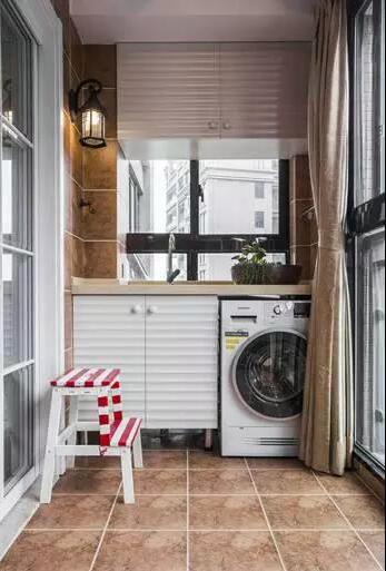 这个阳台同样的担负了洗衣间的功能,然而盆景却并只放了简单的一盆绿。一盏欧洲近代感十足的灯,与红白相间的矮椅,凸显出了简约欧风的感觉。生活气息浓厚,又不失体现主人的品位。