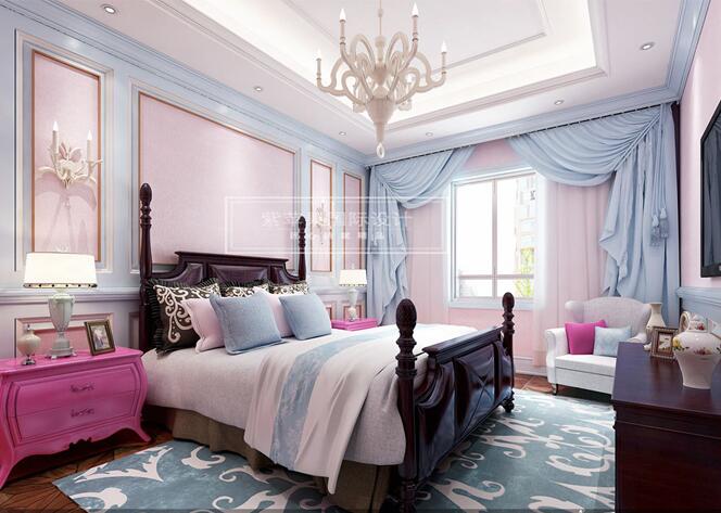 漫步到主卧的瞬间,浓浓的少女粉迎面而来,初恋般的感觉涌上心头,看那粉色和蓝色的对比色不失稳重,更凸显了高贵。也更是体现了男主和女主人之间的甜蜜爱情,天长地久。