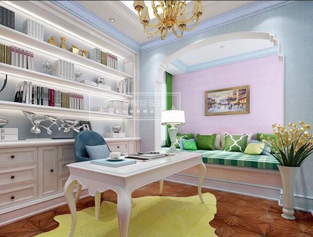 再转角一瞥便是,书香浓浓的书房。书房是智慧和安静的圣域,白色,海蓝色,深色地板的搭配,让人很快的安静下来去融入书海中,犹如身临其境,体验在书海中畅游的乐趣,累了可以有个软包沙发小息片刻。